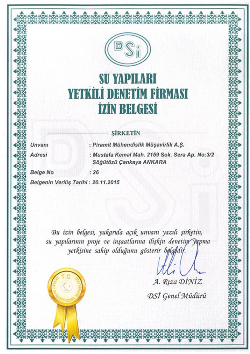 Finally, our company is chosen by the Administration of the State Hydraulic Works (DSİ) on 20 November 2015 as a competent controller for projects and work on the construction of hydraulic structures.